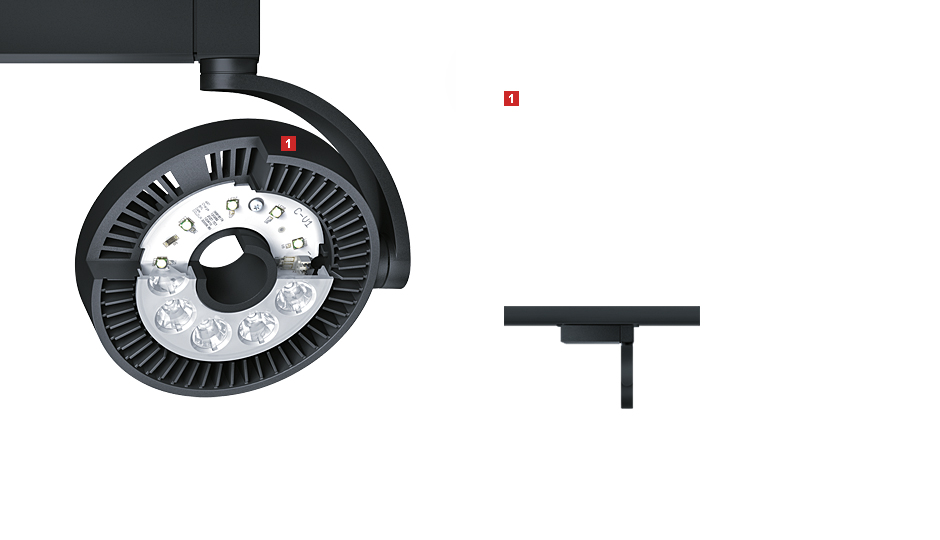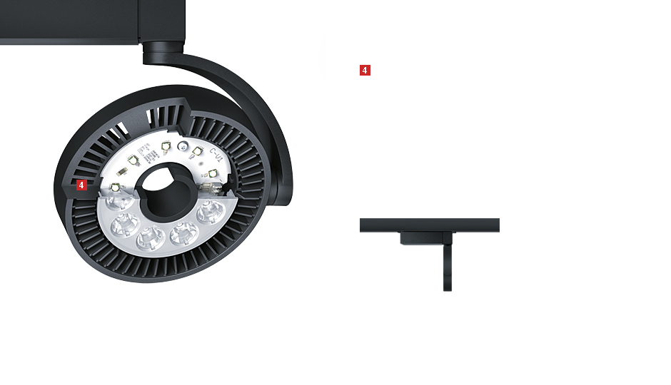 Its delicate but robust design is creatively inspired by cutting-edge LED technology: a flat, minimalist shape with an unmistakable appearance – characterised by the radial fins of the passive heatsink and its illuminated replaceable optic. It fulfils the exacting demands made on sales-promoting accent lighting with dependable accuracy and extremely good colour rendering (Ra 92). The new DISCUS LED-generation Evolution achieves double the luminous flux and efficiency of its predecessor. The luminaire is dimmed on the actual spotlight itself or by DALI control commands, both these methods have a positive impact on energy consumption.
